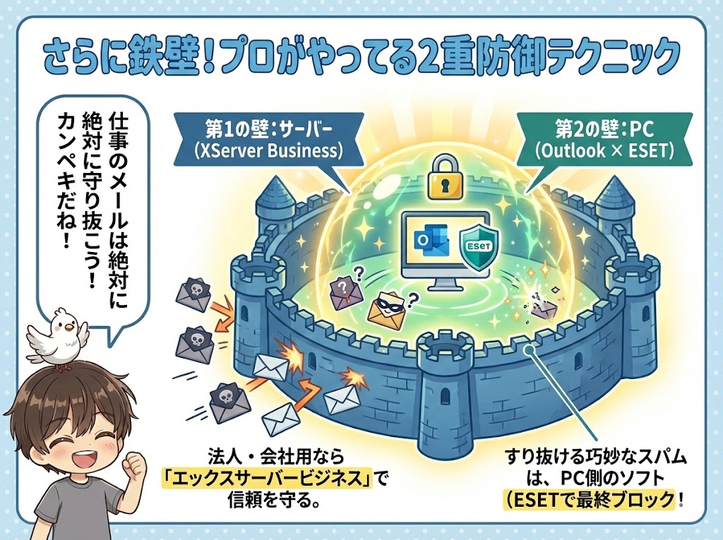 この記事では、エックスサーバーのスパムフィルタとブラックリストの設定方法、そして私の実体験に基づく2つの確実なアプローチ(会社用ビジネスプランの活用・Outlook×ESETの導入)をご紹介しました。