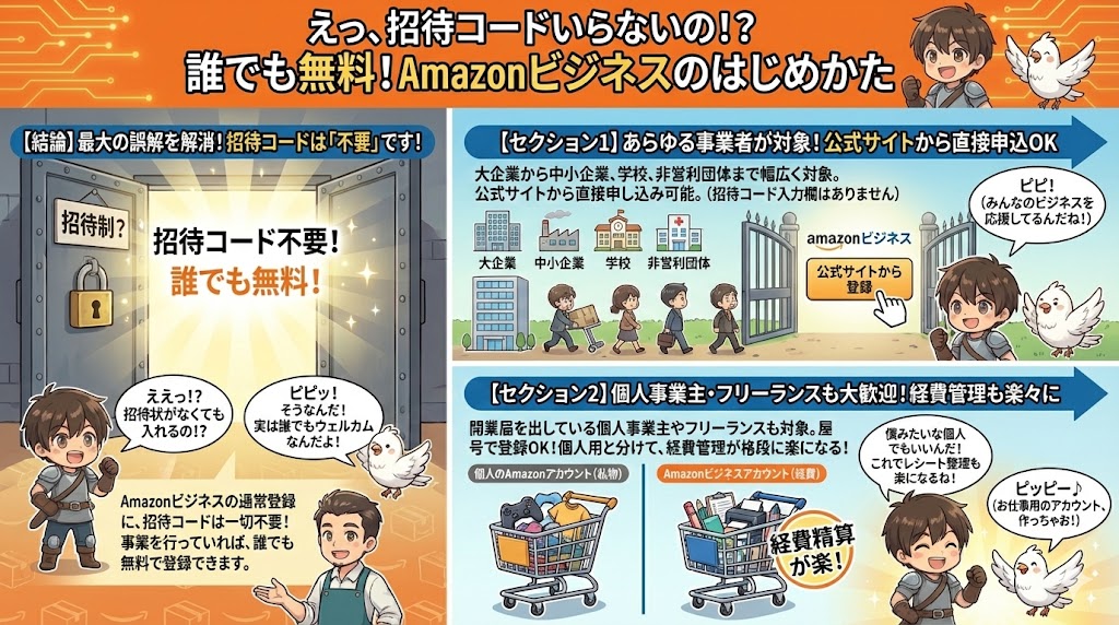 過去のサービス仕様や、一部の招待制サービス(例:初期のGmailなど)のイメージから、「ビジネス向けサービス=招待制」という先入観を持っている方もいるかもしれません。しかし、現在のAmazonビジネスは、広く門戸を開いたオープンなプラットフォームです。