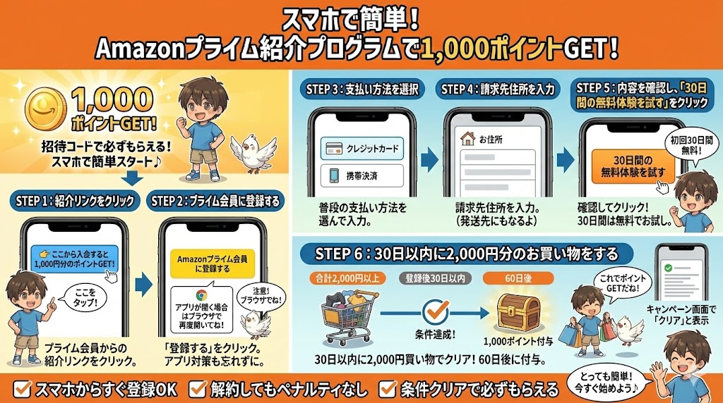 Amazonプライムの「紹介プログラム」から入会すると、1,000円分のAmazonポイントがもらえます。スマホからでも簡単にできるので、一緒に手順を確認していきましょう。