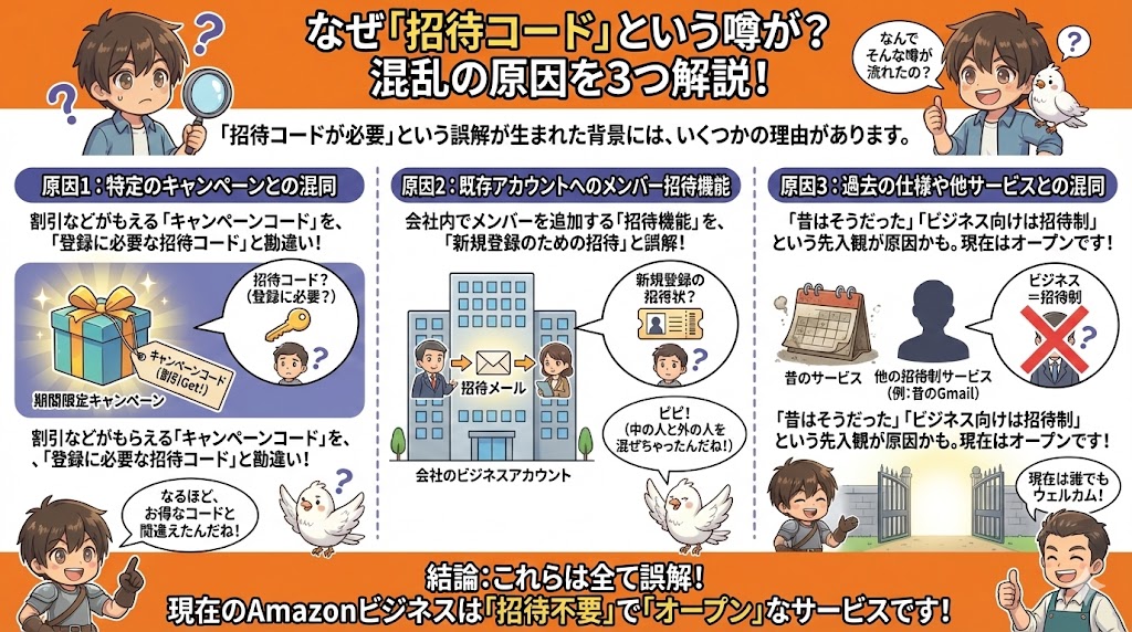 Amazonビジネスには、一つのビジネスアカウントに複数のユーザーを追加できる機能があります。例えば、企業の管理者が経理担当者や購買担当者をアカウントに招待する場合、招待メールが送られます。このメールに含まれるリンクが、一種の「招待」として機能するため、「招待がないと参加できない」という誤解を生む一因となっています。