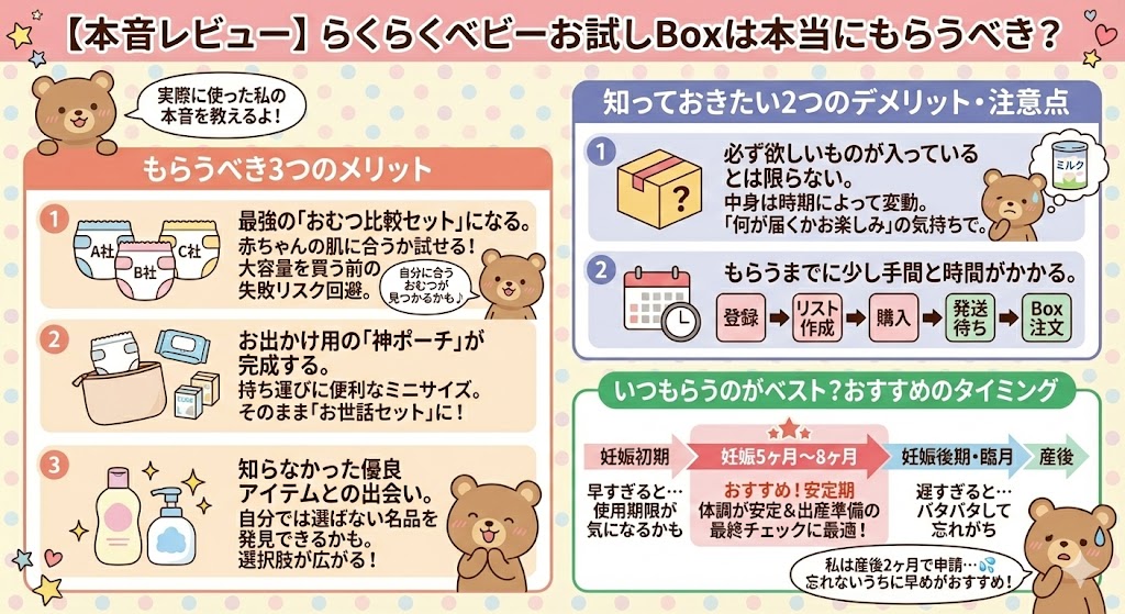 「無料でもらえるのはわかったけど、手続きする価値は本当にあるの?」 そんな疑問にお答えするため、実際に「お試しBox」をもらった私が感じたメリット・デメリットを正直にレビューします。