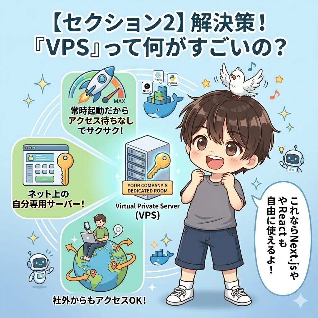 VPS(Virtual Private Server)は、インターネット上に「自分専用のサーバー」を借りられるサービスです。Linuxが動いていて、Node.jsもPythonもDockerも自由に動かせます。